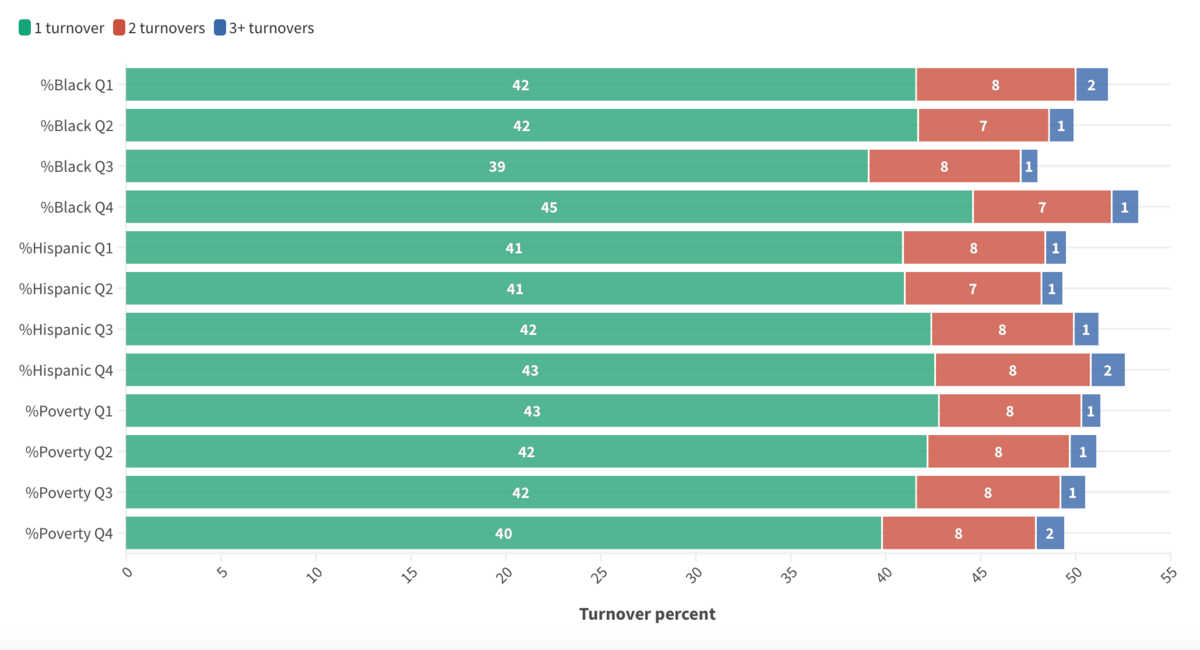 Just as some states and districts are more likely to be exposed to diverse leaders, others have higher rates of superintendent attrition.47 Superintendent turnover tends be higher in larger districts with a greater proportion of students receiving free and reduced-price lunch and students of color, as well as districts offering lower pay (see Figure 4).48 When delineating between superintendents who move to another district or another position versus those who leave the profession, movers and position changers tend to be from rural or smaller school districts, in contrast to leavers, who tend to be from larger, urban districts.49 Some research suggests that districts serving large proportions of students living in poverty and with fewer financial resources have higher superintendent turnover than those serving more affluent communities.50